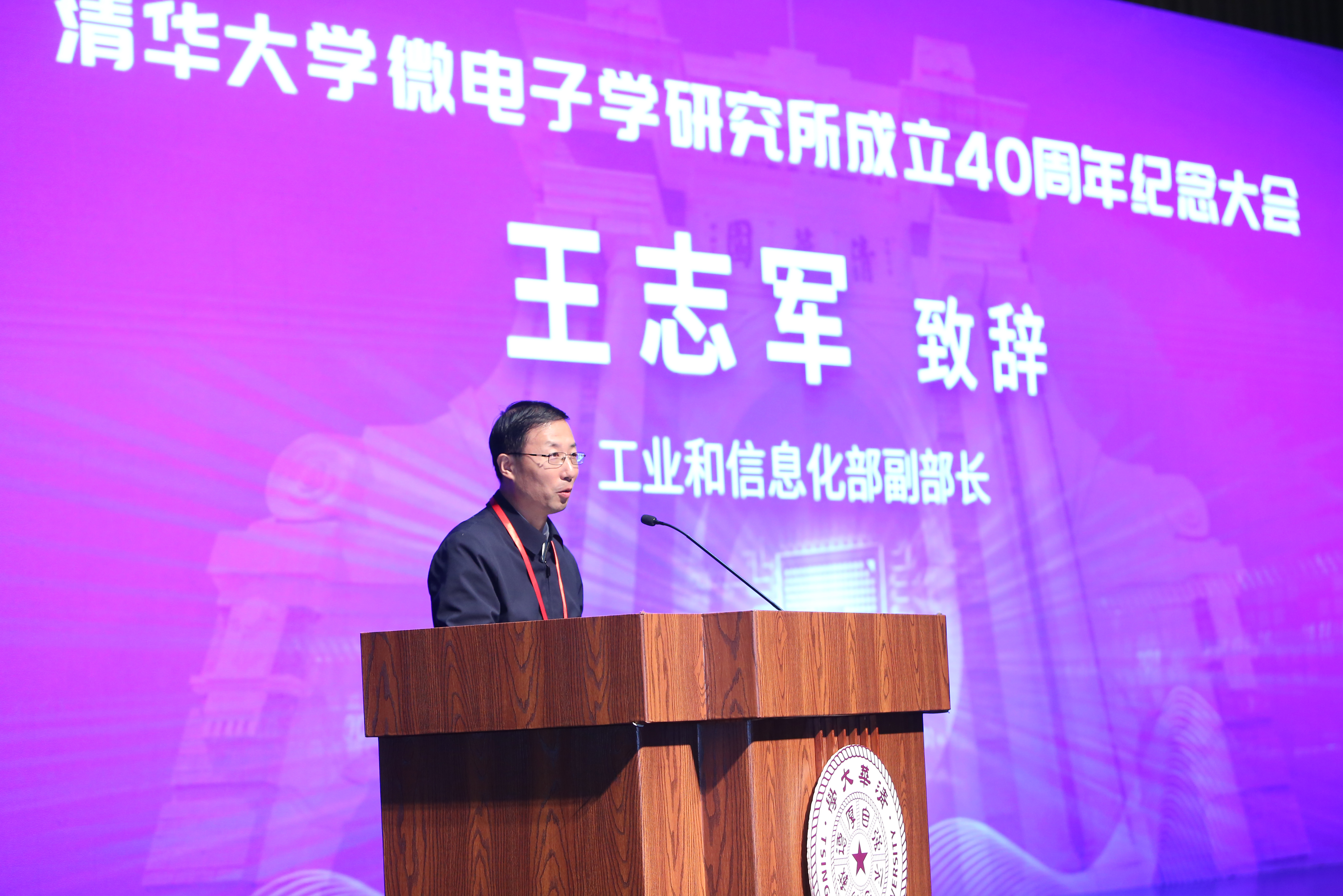12月12日上午,清华大学微纳电子系/微电子所于清华大学新清华学堂举办微电子学研究所成立40周年纪念大会。工信部副部长王志军,中国科学院副院长、中国科学院大学党委书记、校长李树深,国家外专局原局长马俊如,贵州省原常务副省长张树魁,科技部原副部长马颂德,科技部原副部长曹健林,中国工程院原副院长邬贺铨,南开大学原校长龚克,国家自然科学基金委信息学部主任郝跃,信息工程大学原校长王正德,工信部电子司司长乔跃山,科技部重大专项司副司长邱钢等校外嘉宾,多位电子信息领域的中国科学院院士、中国工程院院士,中国电子学会、中国半导体行业协会等学会代表, 来自国家集成电路产业投资基金、三星集团、中芯国际、华虹宏力、长江存储、合肥长鑫,华为海思、中兴通讯等企业代表,27所全国示范性微电子学院院长,清华大学校长邱勇,清华大学常务副校长王希勤,清华大学校务委员会副主任史宗恺,清华大学原副校长张凤昌,清华大学信息学院院长戴琼海及兄弟院系领导、学校各部处领导等校内嘉宾,返校校友等约600人参加了纪念大会。清华大学微纳电子系党委书记蔡坚主持大会。微纳电子系系主任、微电子所所长吴华强进行了工作汇报。
