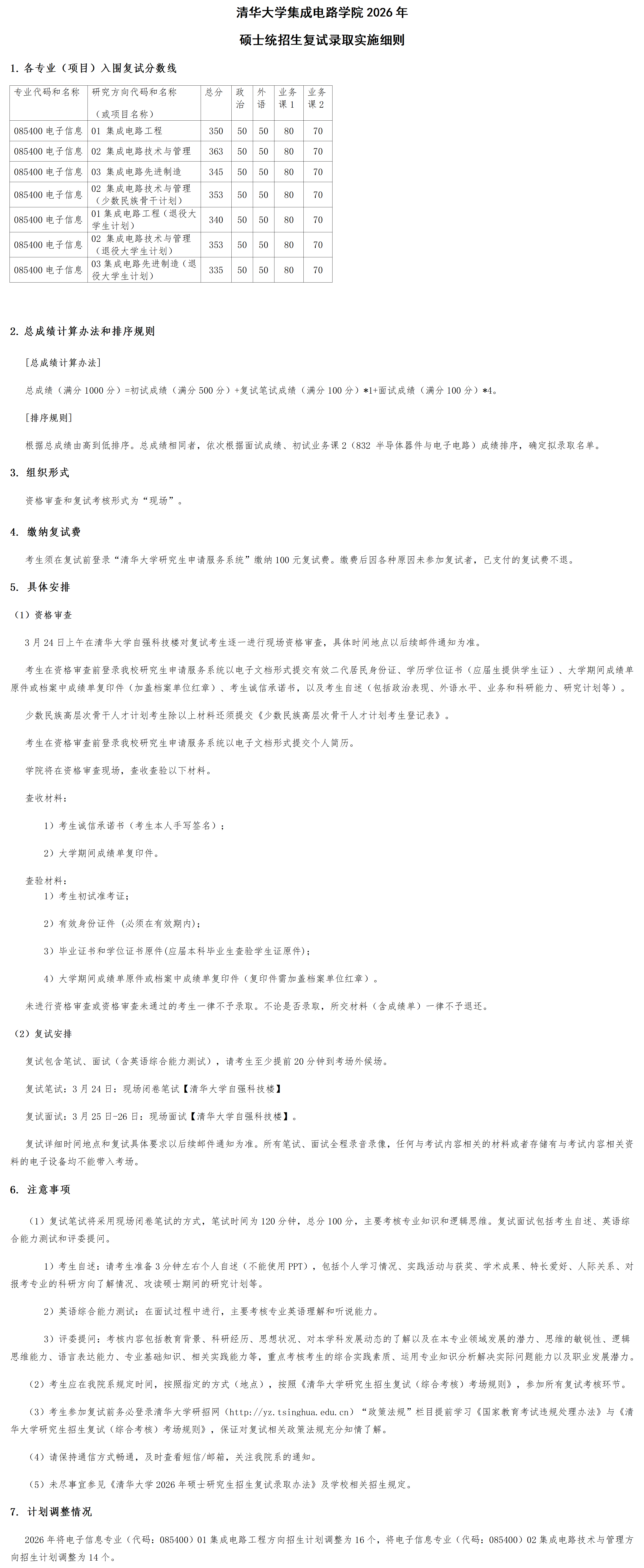 清华大学集成电路学院2026年硕士统招生复试录取实施细则
